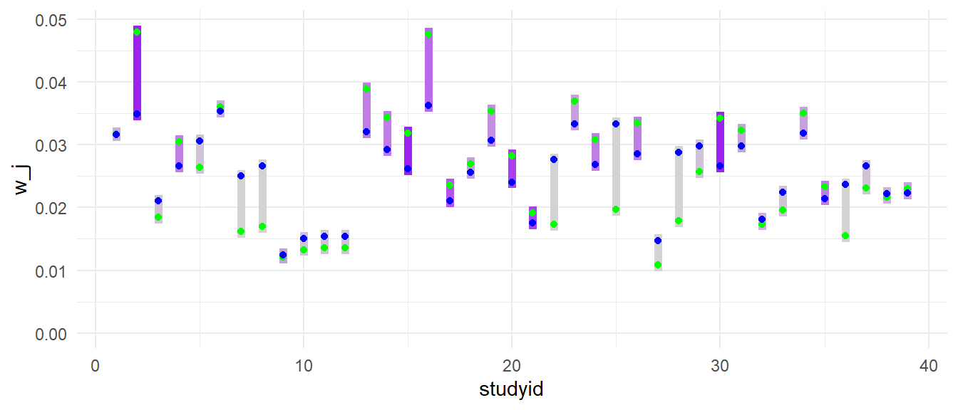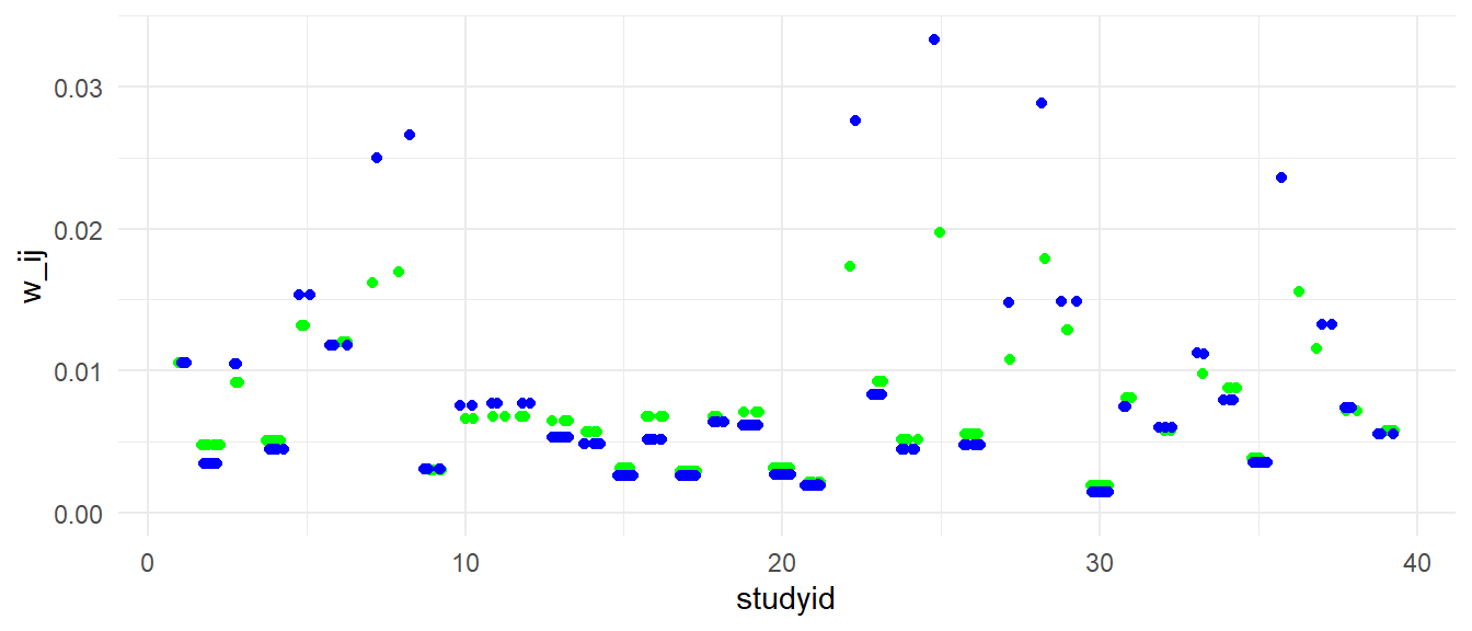 Here is a plot showing the weights of individual effect sizes for each study. In blue are the weights under the assumption that \(\omega^2 = 0\). In green are the weights allowing for \(\omega^2 > 0\). It’s notable here that introducing the within-study heterogeneity term leads to pretty big changes in the weights for some studies. In particular, studies that have only a single effect size estimate (e.g., studys 7, 8, 22, 25, 28) lose a lot of weight when \(\omega^2 > 0\). That’s partially because \(\omega^2\) tends to pull weight towards studies with more effect sizes, and partially because of the change in the estimate of \(\tau^2\), which tends to equalize the weight assigned to each study.