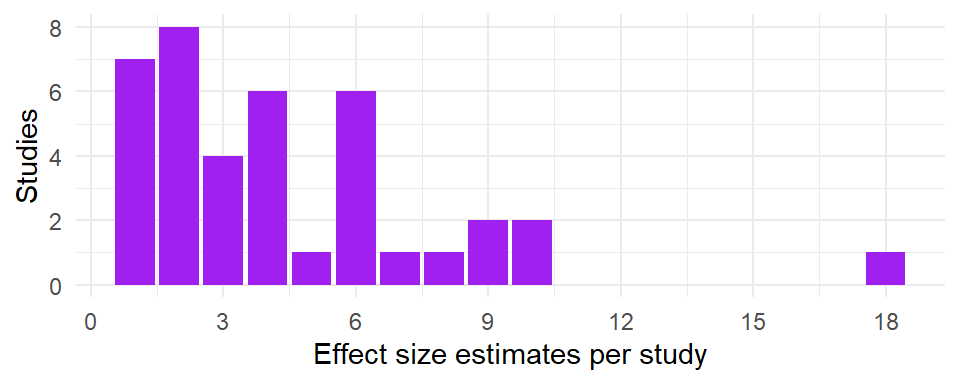 This dataset included a total of 171 effect size estimates from 39 unique studies. For each study, between 1 and 18 eligible effect size estimates were reported. Here is a histogram depicting the number of studies by the number of reported effect size estimates: