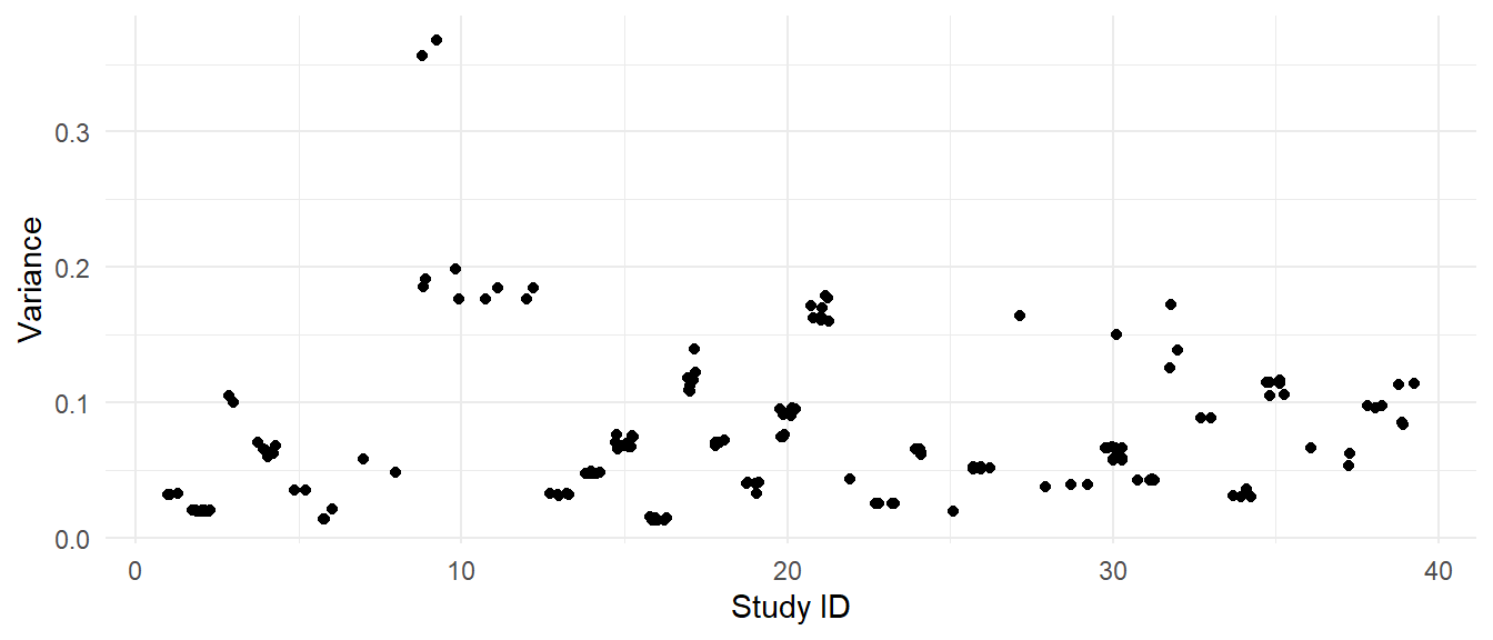 Here is the plot of the variances of each effect size versus the study IDs:
