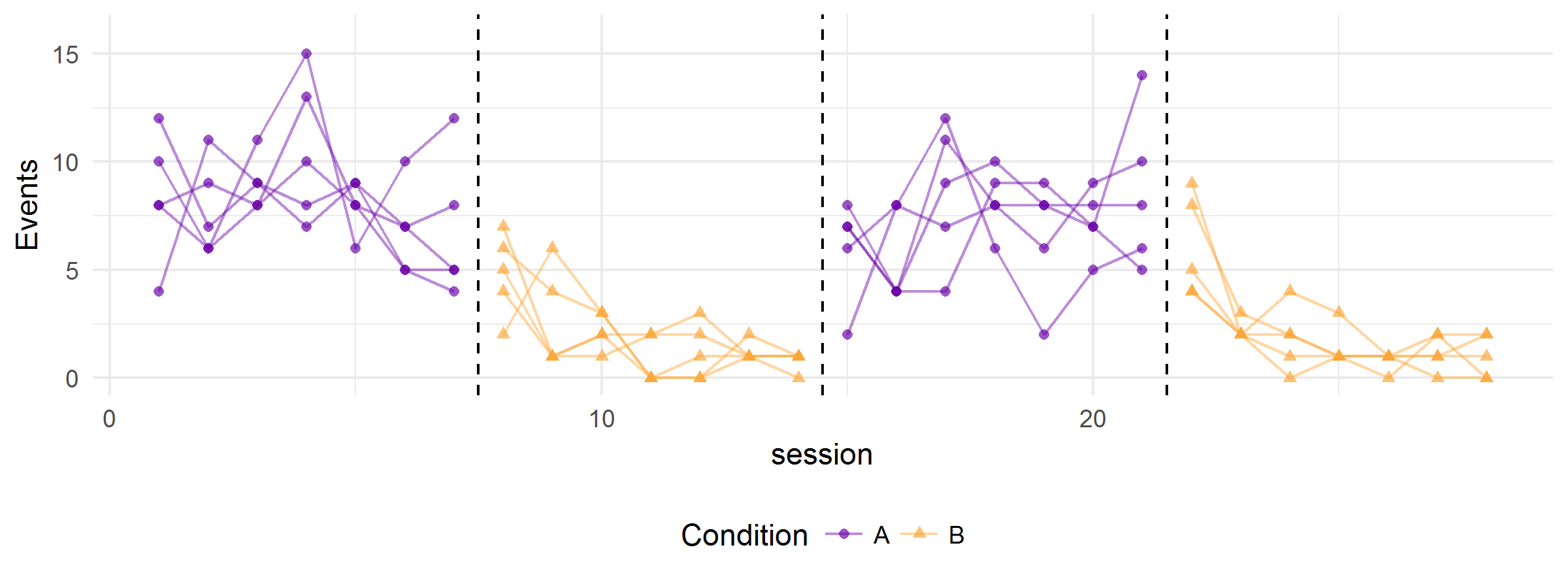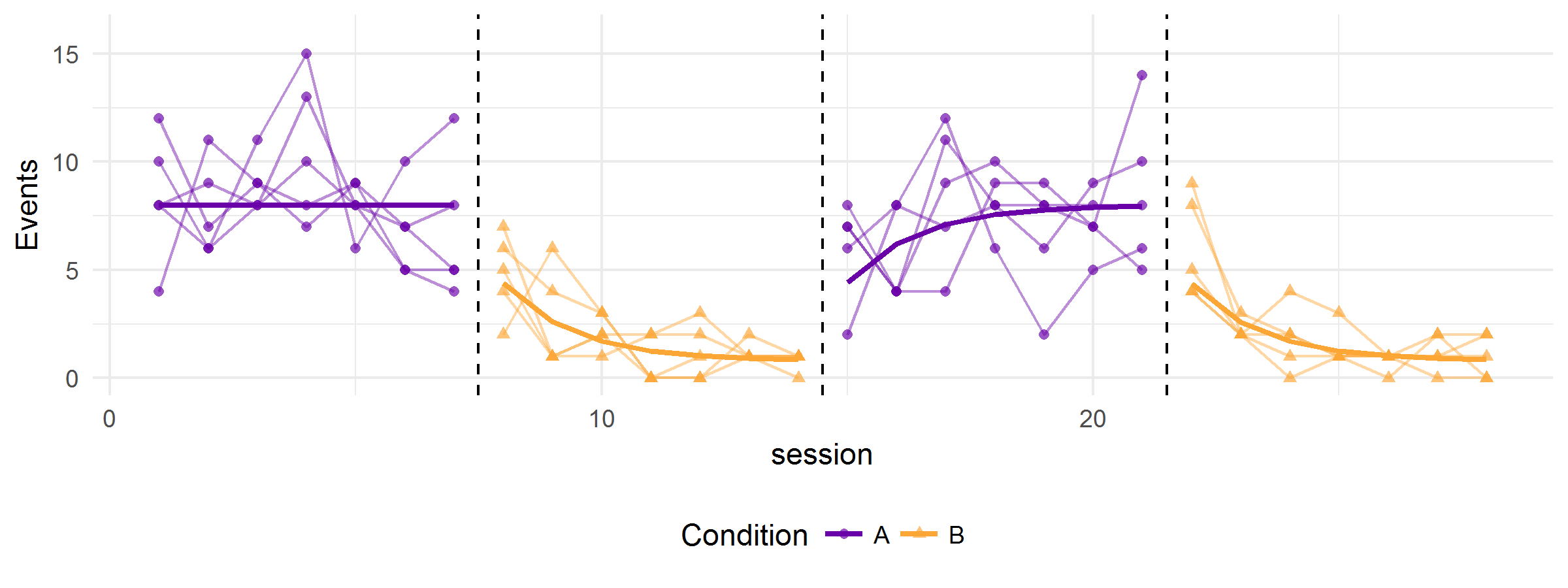 - Currently, the outcome data are simulated as independent across observation sessions (given the true time trend). It wouldn’t be too hard to add a further option to generate auto-correlated data, although this would further increase the complexity of the model. Perhaps there would be a way to add this as an “advanced” option that would be concealed unless the user asks for it (i.e., “Are you Really Sure you want to go down this rabbit hole?”). So far, I have avoided adding these features because I’m not sure what reasonable defaults would be.