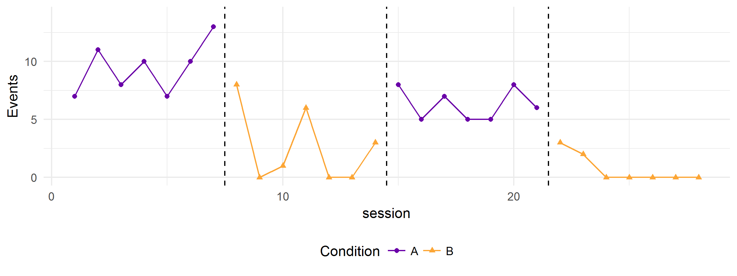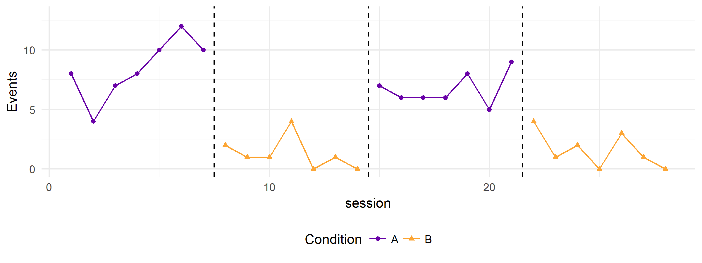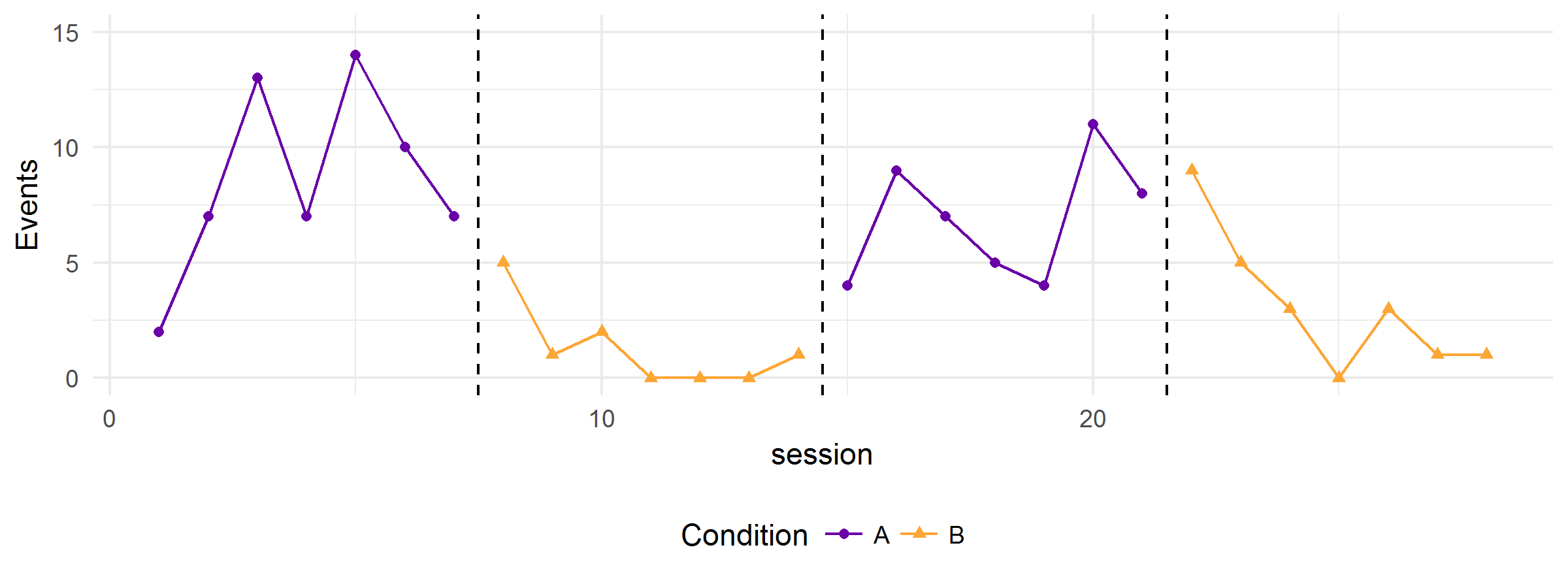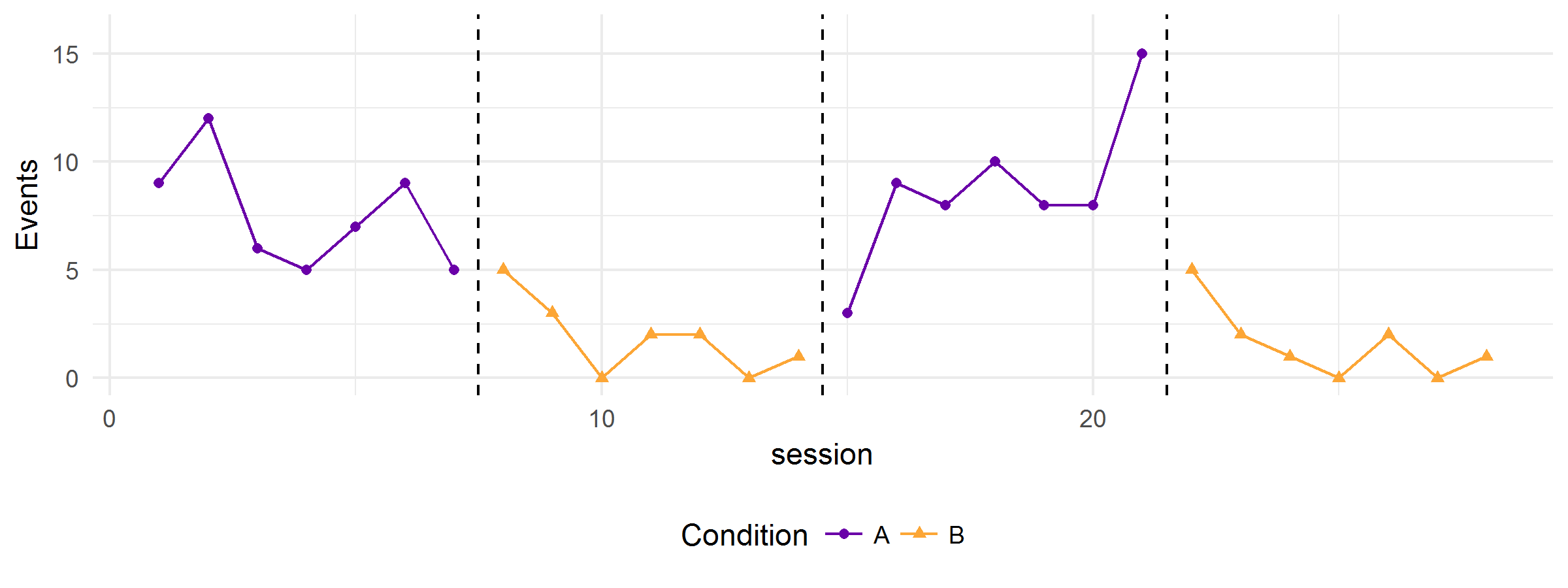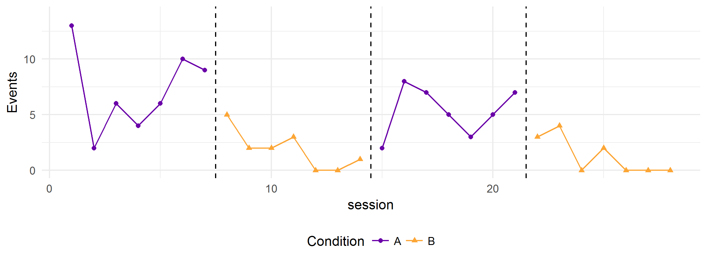 Here’s an example of the sort of data that the tool generates and the assumptions it asks you to make. Say that you’re interested in evaluating the effect of a Social Stories intervention on the behavior of a child with autism spectrum disorder, and that you plan to use a treatment reversal design. Your primary dependent variable is inappropriate play behavior, measured using frequency counts over ten minute observation sessions.