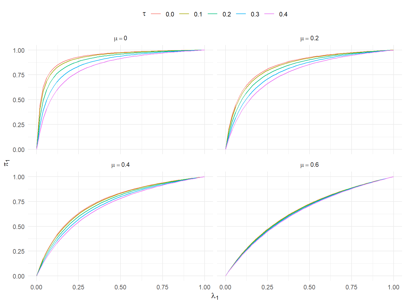 )Figure 1 shows how the mixing proportion changes as a function of the selection parameter \(\lambda_1\) for several different values of the average effect size \(\mu\) and between-study heterogeneity \(\tau\), using the same set of \(\sigma_i\) values simulated above. It is a fairly complicated function. For smaller average effects, the degree of heterogeneity has relatively more influence on the shape of the function, whereas for larger average effects, the degree of heterogeneity hardly matters. And everything depnds on the \(\sigma_i\) distribution; changing it would shift all of the curves in the picture.