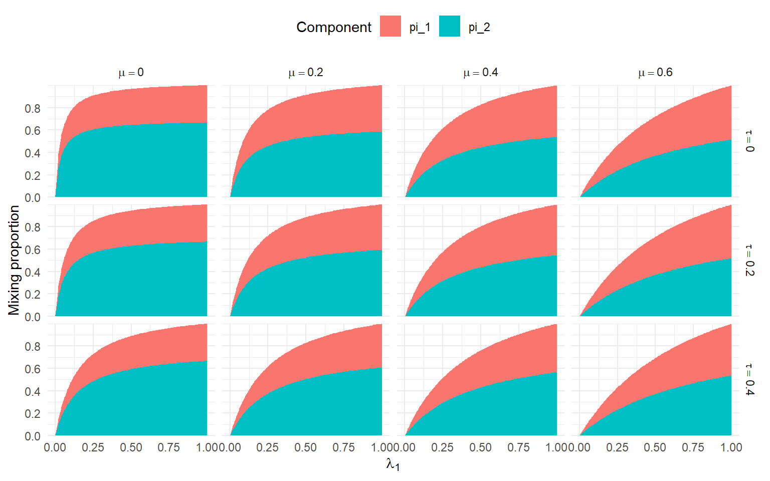#| fig-cap: "Mixing proportions $\\pi_1$ and $\\pi_2$ as a function of selection parameter $\\lambda_1$, setting $\\lambda_2 = 0.5 \\lambda_1$, for selected values of $\\mu$ and $\\tau$."